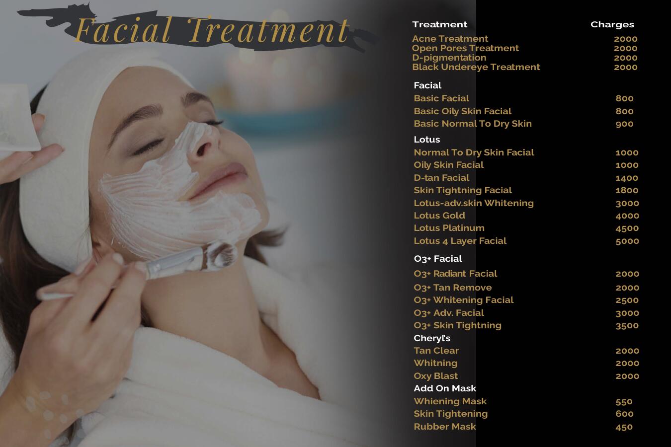 Choose from our Basic, Lotus, O3+, and Cheryl's facials, each tailored to your skin type and needs. Elevate your facial experience with our Add-On Masks for an extra glow.