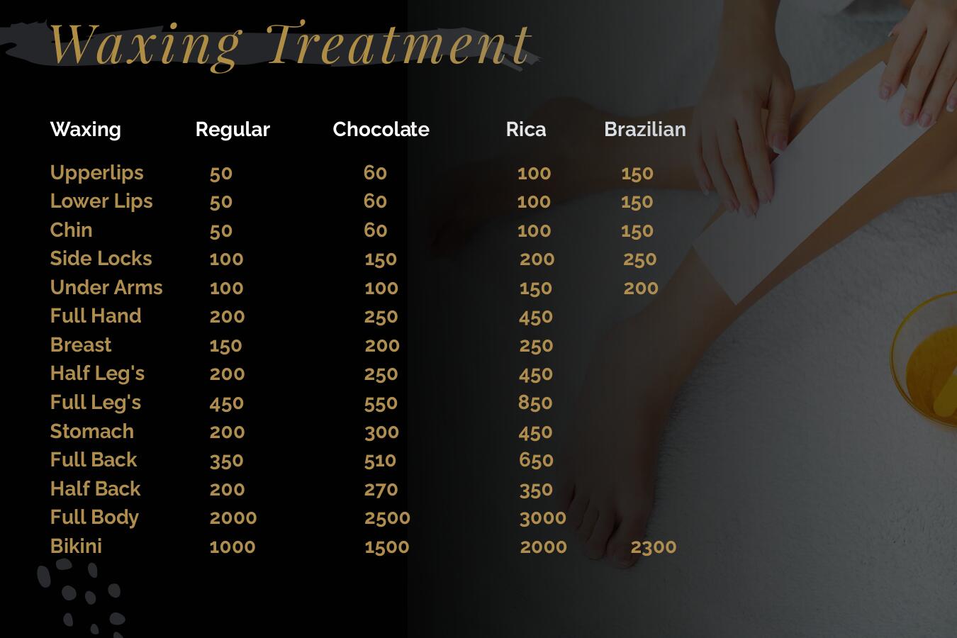 "Feel smooth and confident with our waxing services. From Full Hand to Full Body, we have you covered. Achieve the look you desire with our professional waxing treatments. Say goodbye to unwanted hair
