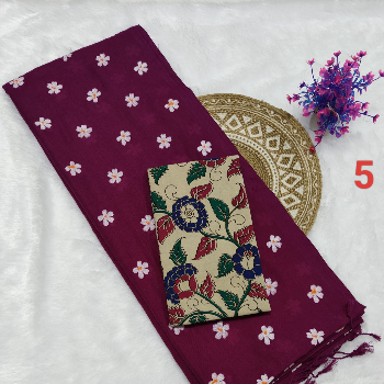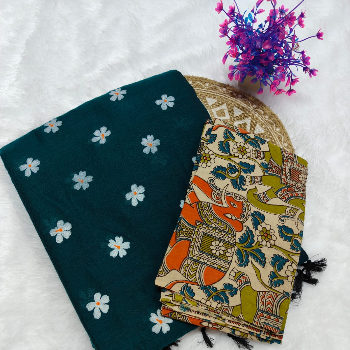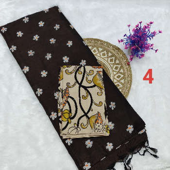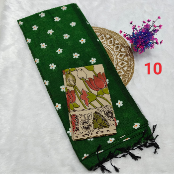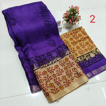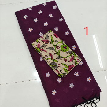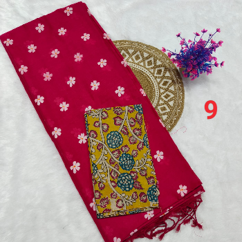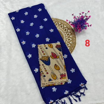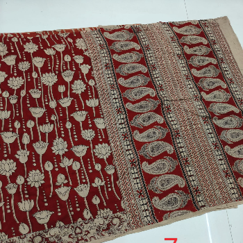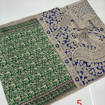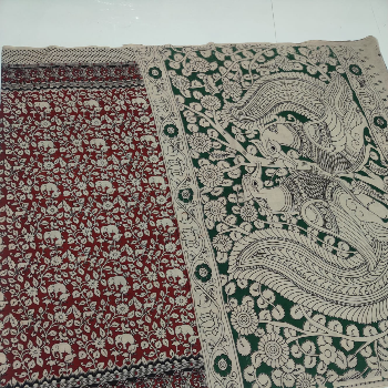 Printed Kalamkari sarees are made by block printing typical hand painted sketches of artisans from Srikalahasti and Masulipatnam in Andhra Pradesh on cotton or silk fabrics. Replicas of Tree of life, flowers, faces, goddesses from ancient Indian mythology, dancing damsels, dolls, peacocks etc. are popular