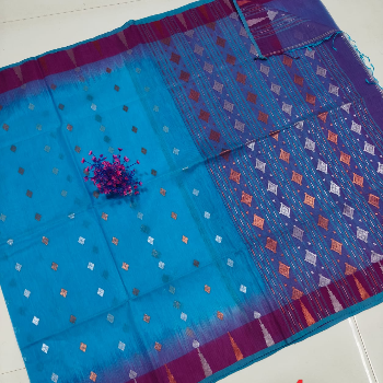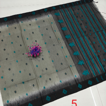 Description. This saree is a classic dark blue color, made from mercerized cotton material. It features a stunning Dhakai Jamdani weave, a traditional handloom weaving technique from Bangladesh. The intricate weave creates a delicate and detailed design that is both elegant and unique.