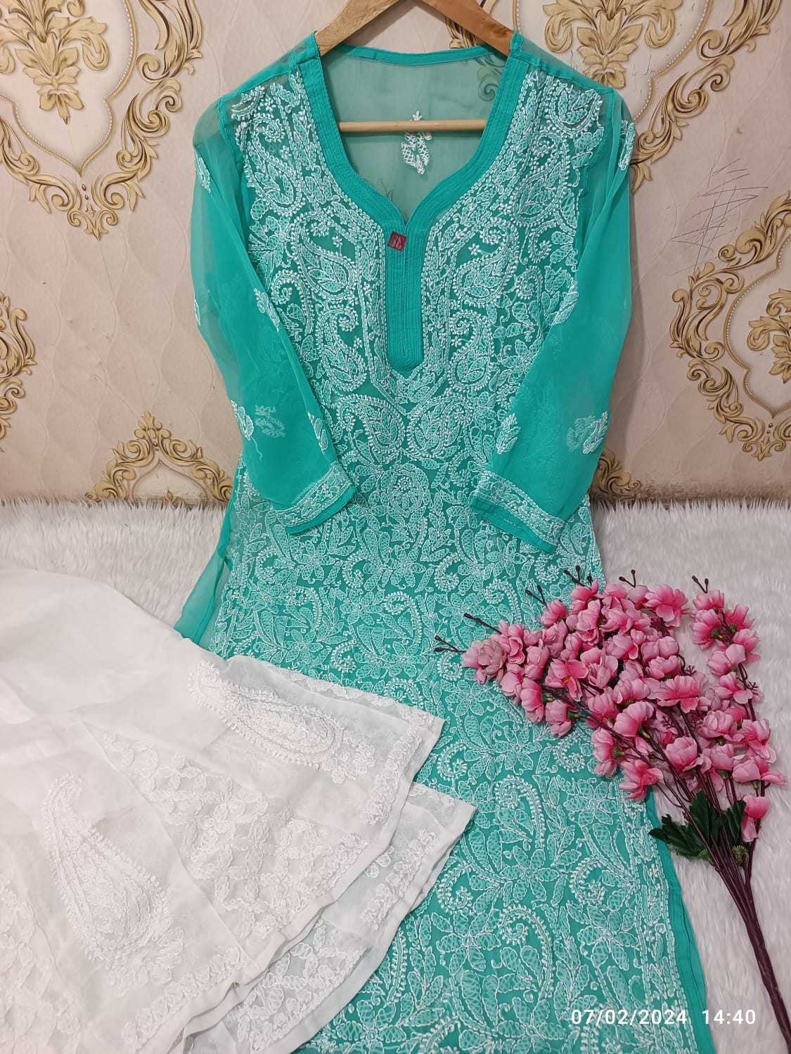 Embrace timeless grace with our Lucknowi georgette chikankari kurti and pant set adorned with intricate mirror work. Available in sizes 38-46. For more designs and Varieties contact us