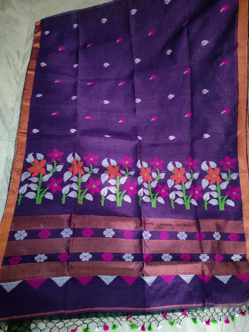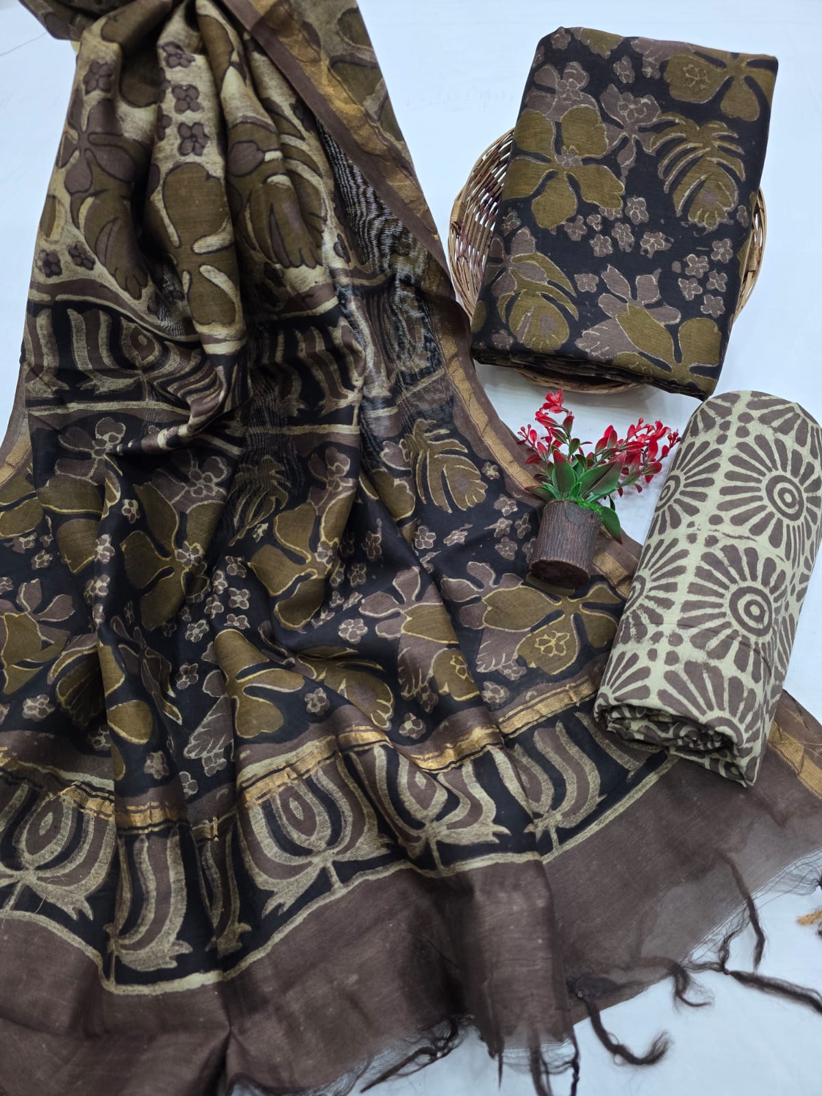 Step into elegance with our Maheshwari silk suit set, complete with a luxurious cotton pajama and a pure Maheshwari silk dupatta. For more designs and Varieties contact us