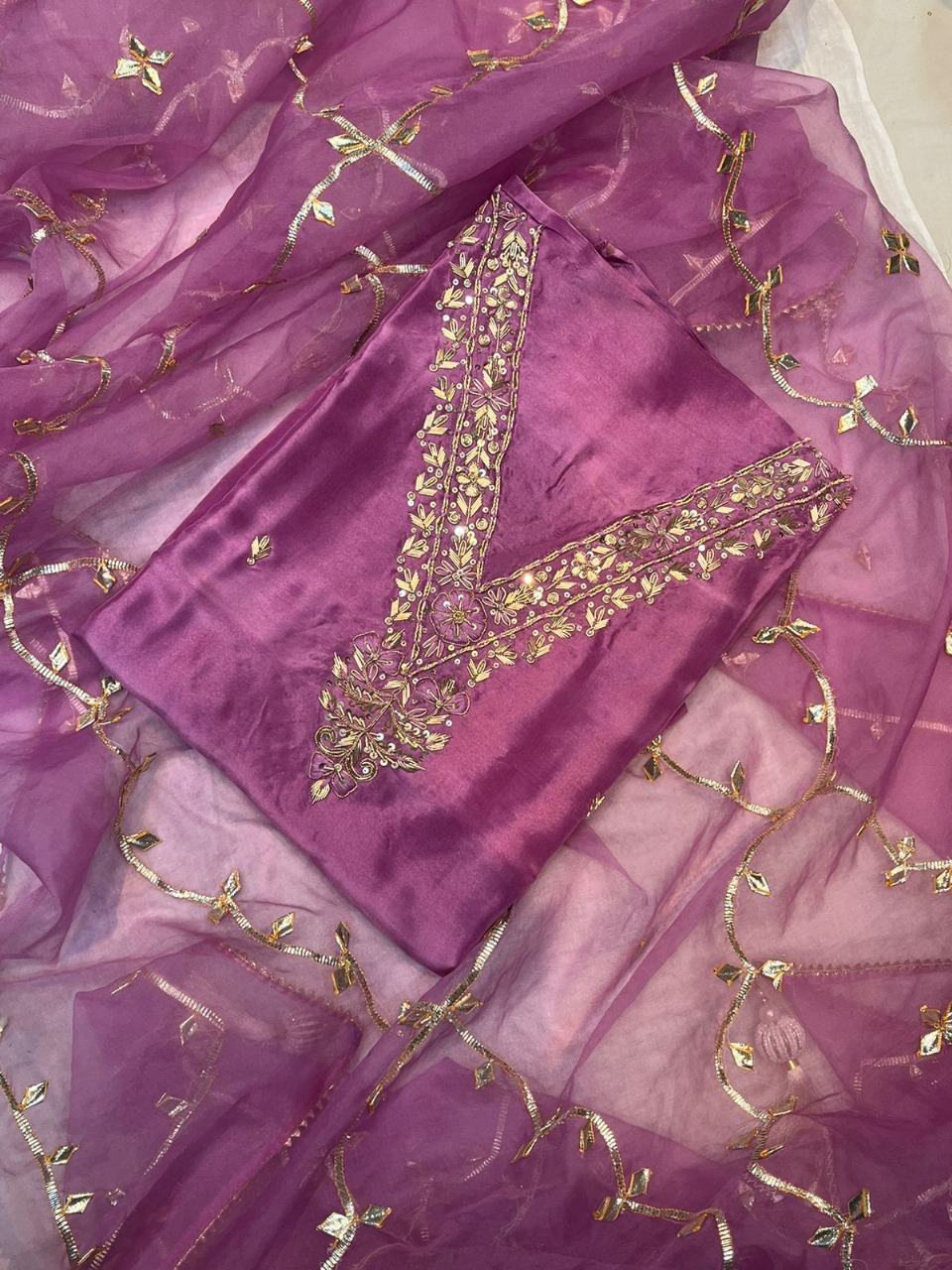 Indulge in luxury with our exquisite Chanderi Silk Top paired with a delicate Organza Dupatta and Santoon Bottom. For more designs and Varieties contact us